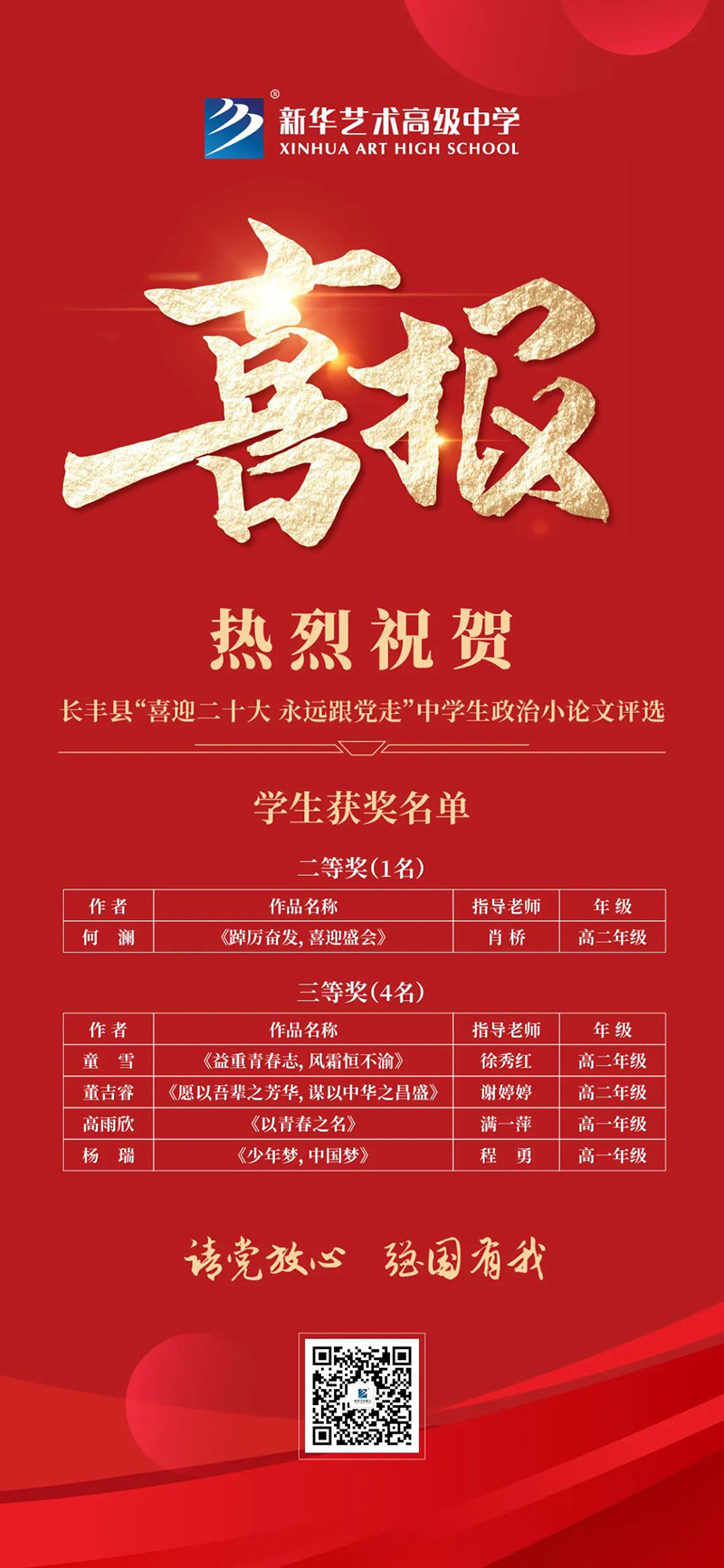 為慶祝黨的二十大即將隆重召開,進一步增強新時代青少年的光榮感、責任感、使命感,引領廣大青少年踐行“請黨放心,強國有我”的青春誓言,贊美新時代,奮進新征程。新華藝術高級中學積極響應長豐縣教體局號召,組織學生踴躍參與長豐縣“喜迎二十大 永遠跟黨走”中學生政治小論文評選活動,獲得可喜成績,共有5人獲獎,其中二等獎1名、三等獎4名。