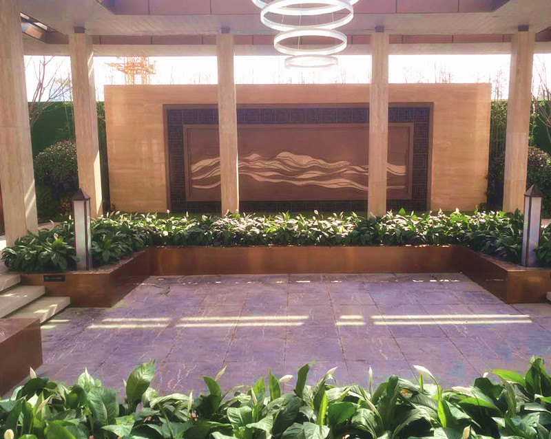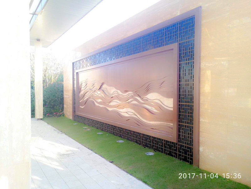廊道北側,一幅鐵藝山水壁畫,恰到好處的豐富了廊道,韻味十足!側面望去,仿佛置身高山峻嶺之間!