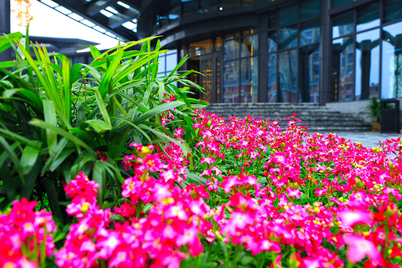 廊道旁,綠油油的草坪,花開正艷的小苗木,修剪成型的灌木,以及筆直的喬木,構成了一處處花境!