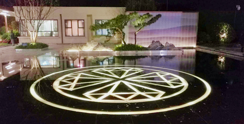 廊道的盡頭,一幅山水畫的屏風,與四周的苗木相映成趣,在燈光的映射下,更加的明亮清爽!