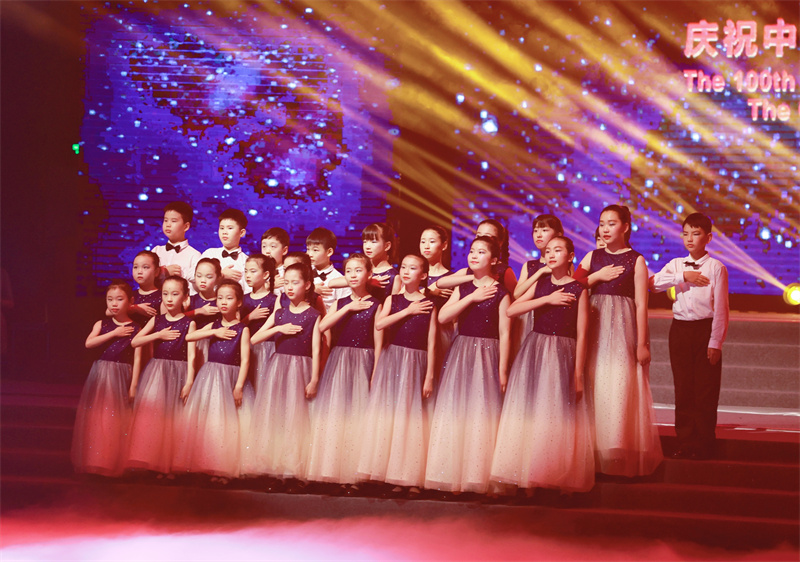 新華公學童聲合唱團完美的用哼鳴式演唱法為晚會三個篇章開場,用歌聲向中國共產黨百年華誕獻禮,用微笑和行動表明作為社會主義接班人的決心:“童心向黨,堅決跟黨走,聽從黨的指揮”。