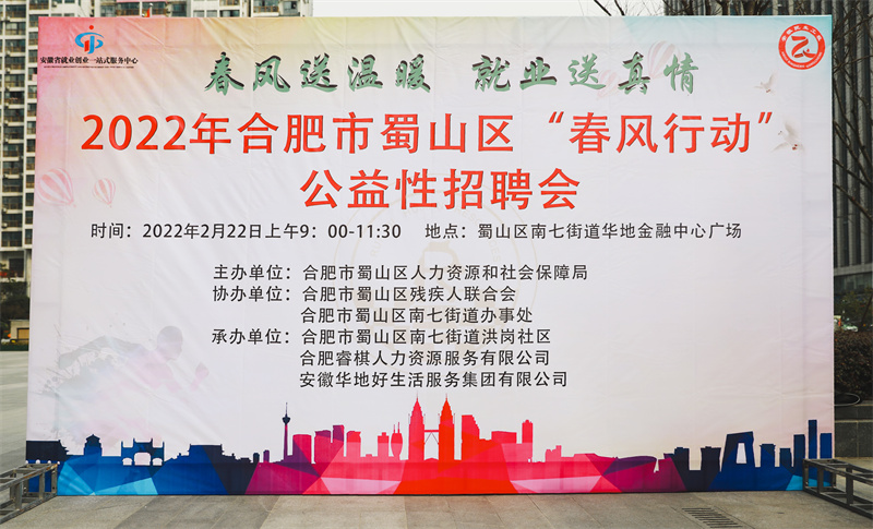 春風送溫暖,就業(yè)送真情。2月22日,由合肥市蜀山區(qū)人力資源和社會保障局主辦、合肥市蜀山區(qū)殘疾人聯(lián)合會、南七街道辦事處協(xié)辦、華地好生活集團承辦的2022年蜀山區(qū)“春風行動”公益性招聘會在華地金融中心廣場盛大舉辦。