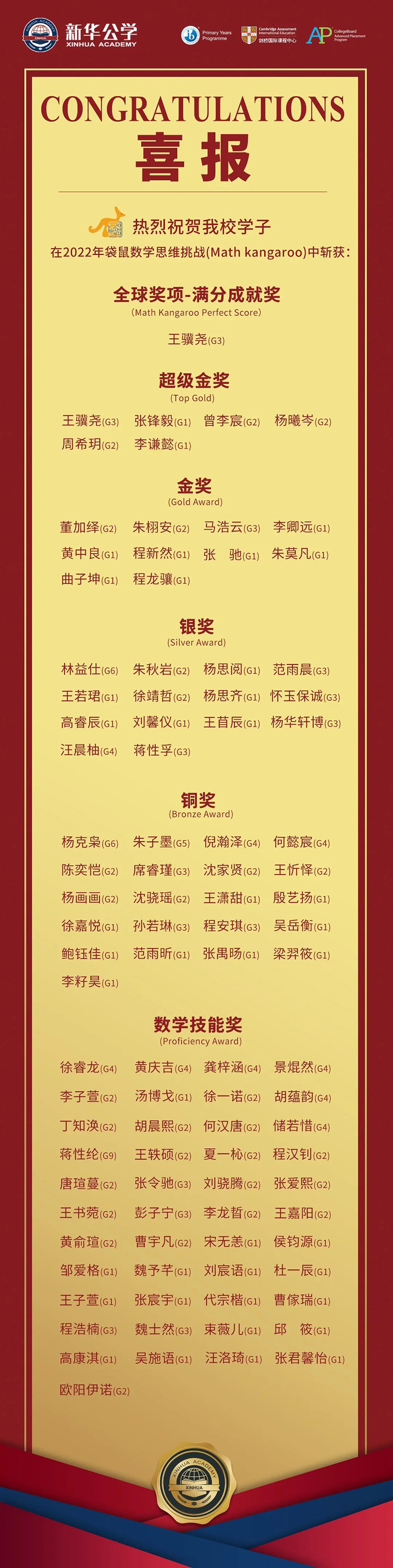 最后,再次祝賀所有獲獎同學(xué)與參賽同學(xué)!對數(shù)學(xué)的興趣只是起點(diǎn),而在自己感興趣的領(lǐng)域深入鉆研、甚至選擇了高出自身年級的難度等級來挑戰(zhàn)自己,這樣的自信力與勇氣更為可貴!我們希望參賽的每一位新華學(xué)子,都能因這樣亮眼的成績而獲得成就感,在以后的學(xué)習(xí)中充滿動力、再創(chuàng)佳績!