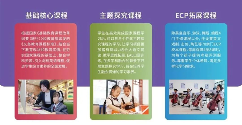 小學課程與教學活動圍繞興趣培養、學習技能及思維方式進行編排;各學科中外教師共同備課,幫助學生建立廣泛的知識關聯;設置多學科融合探究,提升學科素養;分層教學模式及項目式合作學習,針對性提高學生的學術水平;鼓勵學生參與實踐活動,提高學生獨立思考與合作創新能力。