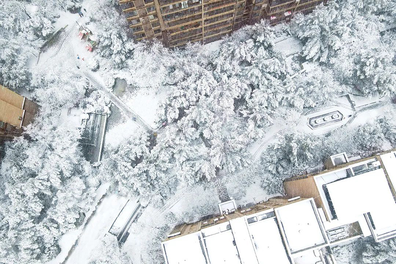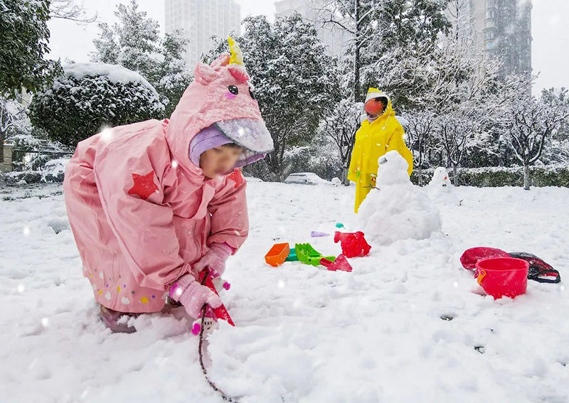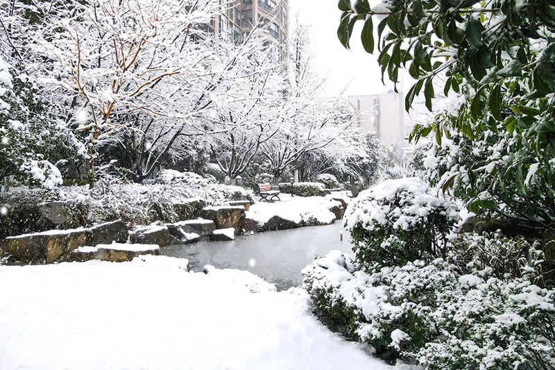 水面上結了晶瑩的冰紋,洋洋灑灑的白色“羽毛”,為華地社區蓋上了一層薄薄的“天鵝絨”。堆雪人,打雪仗,成為了社區里充滿趣味的風景。