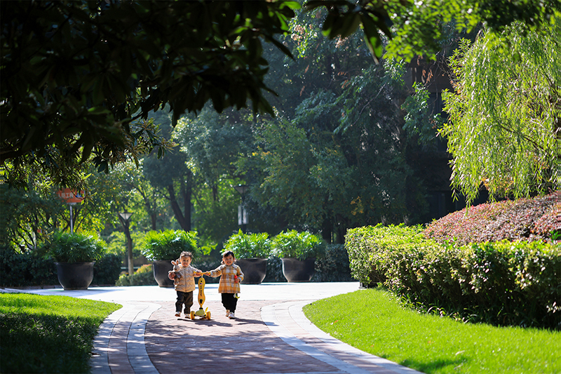 林蔭芳草錯落蓬勃,渲染一片詩意天地,承載著寶貝天真的情態、記錄下家人幸福的笑顏。這份綠意盈懷的美好,是自然的恩賜,更離不開華地對景觀營造的細致用心。